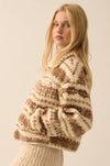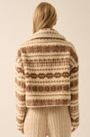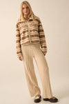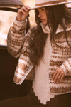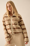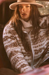 A printed fleece jacket with the following features: Allover geometric alpine print. High collar. Zip-up front closure. Chest pocket. Side pockets. Long sleeves. Dropped shoulder. Full lining. Relaxed fit.