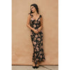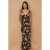 Floral print satin jaquard maxi dress with flutter sleeves.