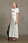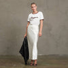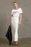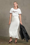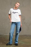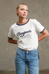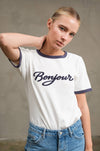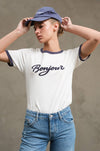 This tee offers exceptional comfort with its 100% cotton fabric and features "Bonjour" embroidered detail in mocha.