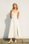 Linen cotton blend sweetheart midi dress with a corset inspired bodice. The editorial model is 5'8" and ecomm model in RED ROUGE is 5'11", in VINEYARD, IVORY is 5'7" and in NAVY is 5'9". They are wearing size Small. - Sweetheart neckline with drawstring fastening and a keyhole detail - Corset bodice - Cinching lace up closures on the back - Chevron waist detail - Hidden side zipper closure - Fit and flare - Only IVORY color has a skirt lining Shell: 70% Cotton, 30% Linen Lining: 100% Cotton