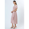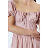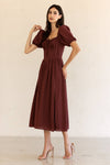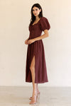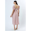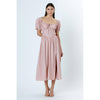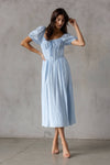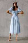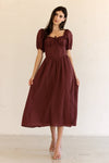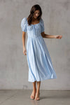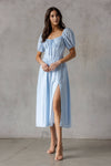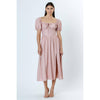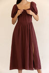 This midi dress combines effortless style with thoughtful details. The lightweight, textured fabric drapes beautifully in a relaxed A-line silhouette that moves with you. A sweetheart neckline features a charming front tie, while short puff sleeves with elastic cuffs add a playful touch. The fitted bustier bodice provides structure and support, while a back zipper ensures easy dressing. A side slit offers subtle movement and elegance, and the full lining keeps you comfortable all day long.