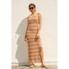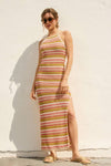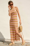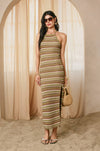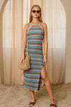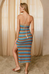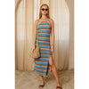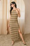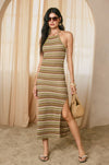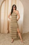 Embrace effortless elegance with this striped bodycon sweater dress, designed for a refined silhouette. The pull-on construction pairs seamlessly with an adjustable criss-crossed back tie and open back detail, while a subtle side slit adds movement and dimension. Fully lined for comfort and confidence. Shell and lining: 100% polyester. Model sizing: PAPAYA SPRINGS (5'6"), SANTORINI (5'9"), IBIZA SAND (5'8"), all wearing size Small.