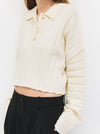 This top features a wide, thick ribbed knit and a cropped silhouette with a relaxed fit. Its polo neckline with partial buttons, drop shoulders, and merrowed seams brings a modern, textured twist to a classic style.