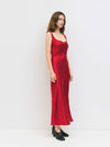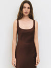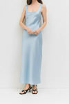 The Colette Dress is a sleeveless slip dress featuring a fluid drape with a soft drop neckline. Finished with subtle binding at the neckline and armholes, it falls to a midi length for a sleek, minimalist silhouette.