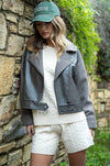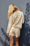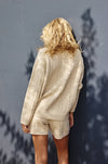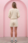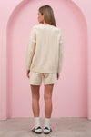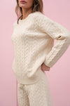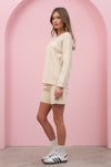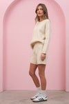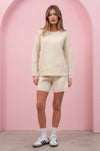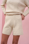 Super cozy cable knit two piece set complete with a crewneck top and mid length shorts.