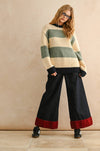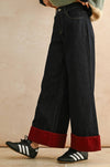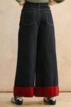 Wide leg denim pants with statement cherry red cuff. Slightly cropped for a chic look.