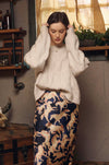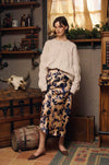 Midi satin skirt cut on the bias for a effortlessly elegant look. The horse print add an aspect of artistry.