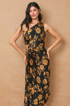 Floral print all over pleated maxi dress featuring an asymmetrical design.