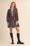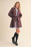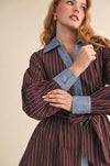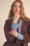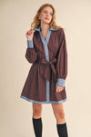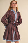 This mini dress features a striped design with a contrasting fabric collar, button placket, sleeve cuffs, and hem. It includes long puff sleeves finished with contrast buttoned cuffs and a self-tie sash threaded through belt loops for a customizable fit. Complete with pockets and a lined interior, this piece combines style and practicality. The model is 5'7" and is wearing size S.