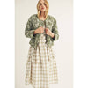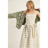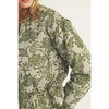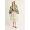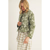 Embroidered paisley floral lightweight padded jacket with a round neckline, hidden zipper, front snap buttons, side double welt pockets, monochromatic bias binding, and a loose boxy fit.