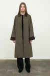 This long olive trench coat is elevated by its corduroy accents on the cuffs and collar, offering a sophisticated touch.