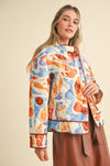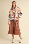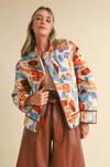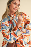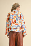Super cozy quilted jacket perfect for Fall with an abstract watercolor print that will brighten up any outfit. Has pockets and zipper/snap closure.