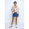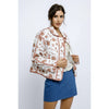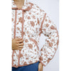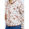 Floral printed padded zipper jacket with a collar, contrast bias binding on edges, hidden zipper, front snap buttons, side double welt pockets, and a loose boxy fit.