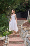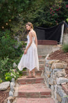 An effortlessly sophisticated midi dress in creamy cotton, designed for timeless elegance. The sweetheart neckline and sleeveless silhouette are beautifully balanced by adjustable straps and delicate lace bodice detailing. Back smocking and a hidden zipper create a refined fit, while the signature handkerchief hem adds graceful movement. Fully lined for comfort and confidence.